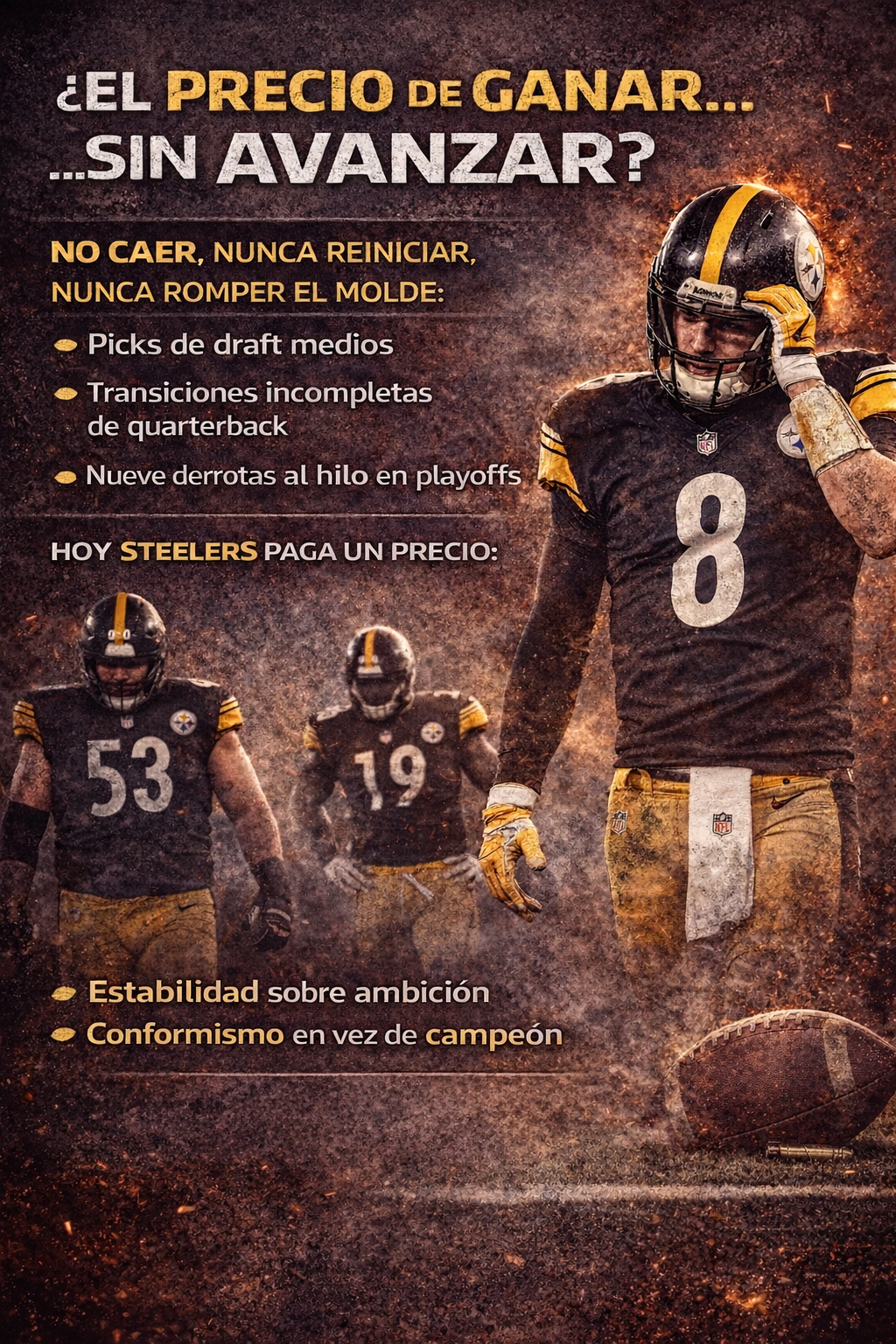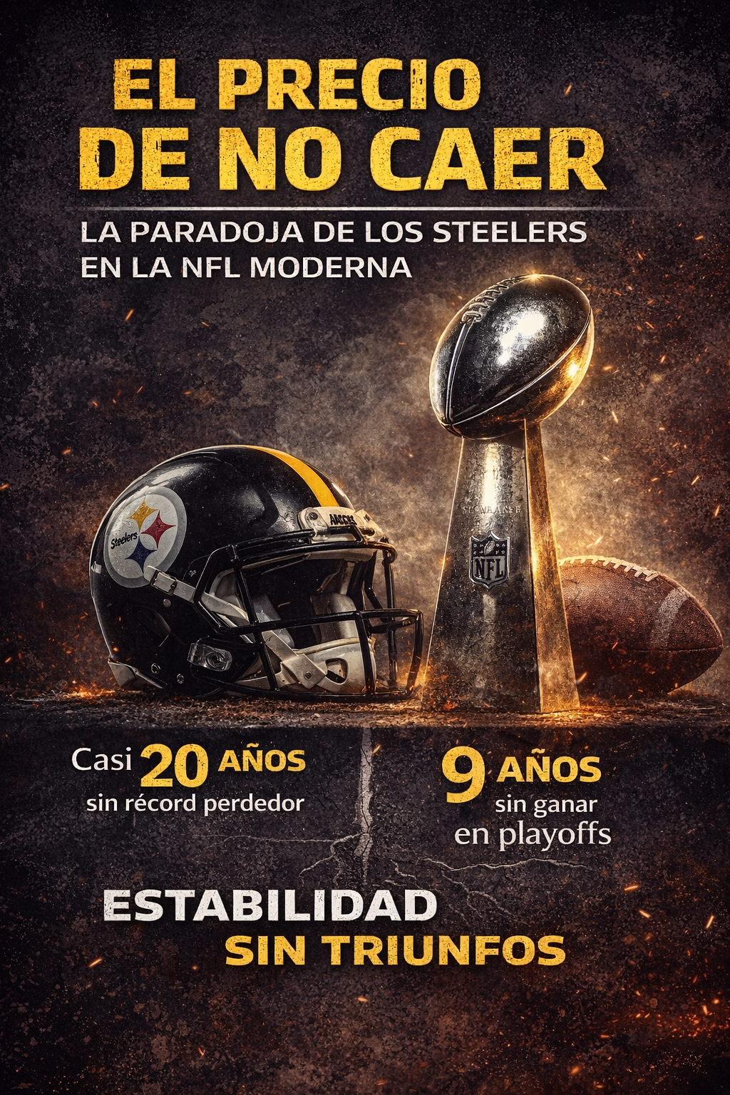 Desde que ganaron el Super Bowl XLIII en febrero de 2009, los Steelers no han vuelto al gran escenario. Y, aun así, durante casi veinte años construyeron una de las rachas más impresionantes de la NFL moderna: ninguna temporada con récord perdedor. Temporadas de 9-8, 10-7, 12-4 o 13-3 se acumularon bajo una misma lógica: competir siempre, caer poco, mantenerse relevantes. El problema es que esa constancia terminó volviéndose circular. Porque, en paralelo, Pittsburgh acumuló nueve años consecutivos, de 2016 a la fecha, sin ganar un solo partido de playoffs. Clasifican, ilusionan, compiten… y se despiden rápido. Año tras año. Nunca caen lo suficiente como para reconstruirse a fondo. Nunca suben lo suficiente como para ser campeones.
