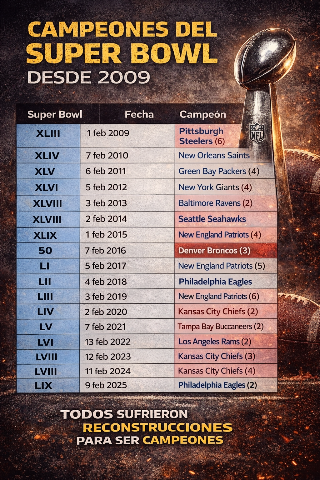 Desde aquel último título, la NFL siguió avanzando y cambiando de manos. La lista de campeones es larga y diversa: New Orleans Saints en 2010, Green Bay Packers en 2011, New York Giants en 2012, Baltimore Ravens en 2013, Seattle Seahawks en 2014, New England Patriots en 2015, Denver Broncos en 2016, Patriots de nuevo en 2017, Philadelphia Eagles en 2018, Patriots otra vez en 2019, Kansas City Chiefs en 2020, Tampa Bay Buccaneers en 2021, Los Angeles Rams en 2022, Chiefs en 2023 y 2024, y finalmente Philadelphia Eagles en 2025. No hubo tricampeonatos consecutivos. Lo que sí hubo fueron ciclos completos, con caídas incluidas.